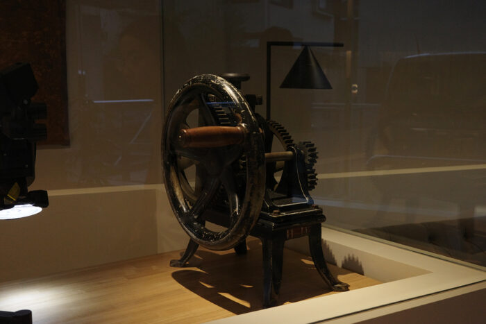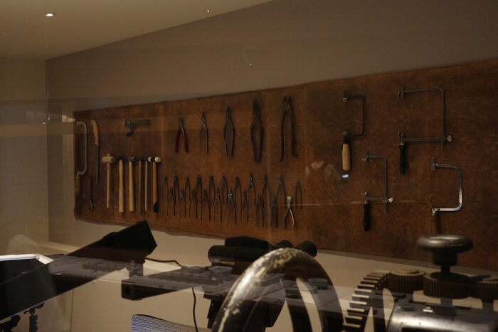 何に使うのだろう…と思った、歯車がついた道具。村瀬さんに聞くと、金属を薄くプレスするための昔の道具だそうで、現在も実際に使用しているそうです。使い込まれた風合いからも、手仕事の歴史の深さを知ることができます。