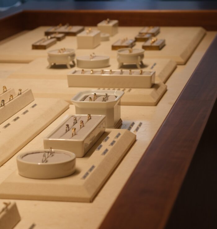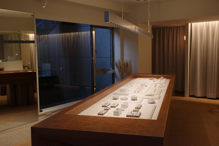 店内中央には、まるでオブジェのような、とても大きなウッドテーブルが。(家具職人さんにオーダーメイドで作ってもらったそうです。)そこには、村瀬さんが手がけるアート性の高いジュエリーやブライダルリングが、凛とした佇まいで並んでいました。