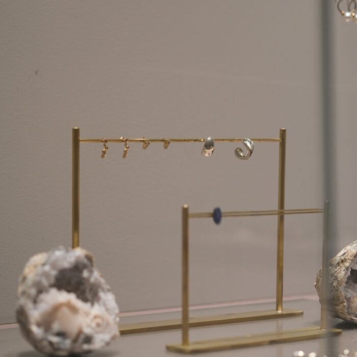 なんと、ジュエリーを飾っているスタンド、ショーケースの取っ手や照明まで、竹内さんの手仕事によって作られているもの。その細やかな作りこみに目が釘付けでした。